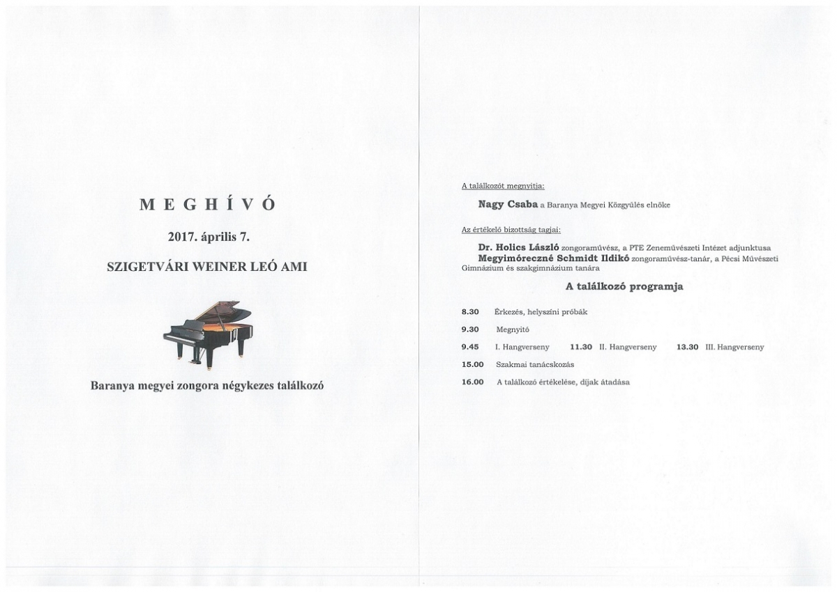 A Baranya megyei művészeti iskolák zongora négykezeseinek a találkozójára kerül sor 2017. április 7-én a Szigetvári Weiner Leó Alapfokú Művészeti Iskolában, (7900 Szigetvár, Zárda u. 2.) mely a napokban kapta meg az Oktatási Hivatal Bázisintézménye címet.