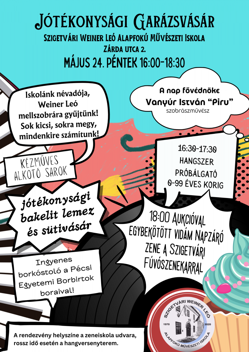 Egy különleges rendezvényre hívunk mindenkit a zeneiskolába. Május 24-én, pénteken 16.00 – 18.30-ig jótékonysági garázsvásár lesz a „hátsó” udvarunkban. (rossz idő esetén a hangversenyteremben) Régi elképzelésünket szeretnénk valóra váltani. Névadónknak, Weiner Leó zeneakadémiai tanárnak, zeneszerzőnek állítanánk egy mellszobrot az utcafronti részen. Rendezvényünk fővédnöke Vanyúr István, azaz Piru szobrászművész, aki majd a mellszobrot is el fogja készíteni.