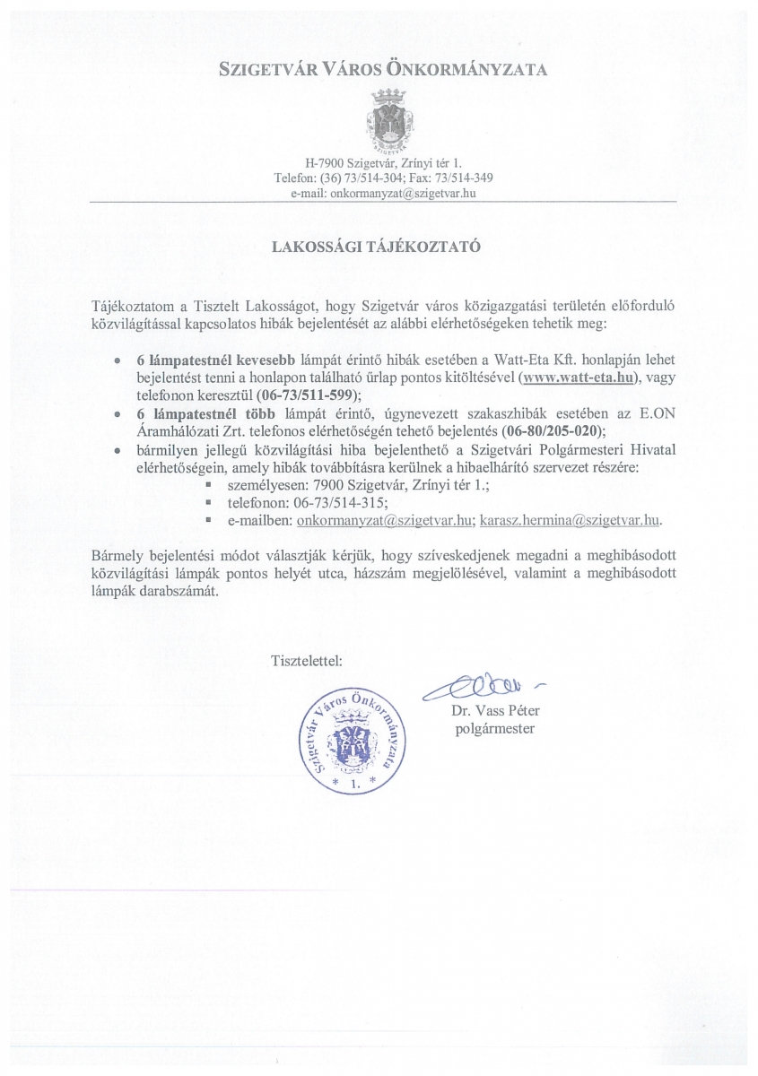 Lakossági tájékoztató - közvilágítással kapcsolatos hibák bejelentésére vonatkozóan