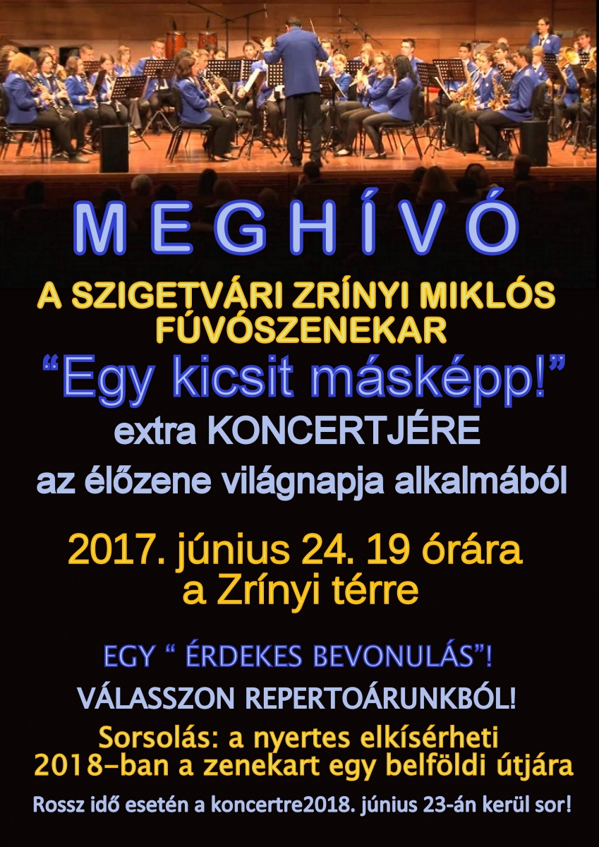 Az Élőzene Világnapja tiszteletére a Szigetvári Zrínyi Miklós Fúvószenekar "Egy kicsit másképp" c. extra koncertjére kerül sor 2017. június 24-én 19 órakor a Zrínyi téren.