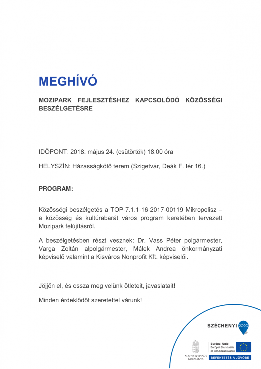 Meghívó - Mozipark fejlesztéshez kapcsolódó közösségi beszélgetésre - 2018. 05. 24.
