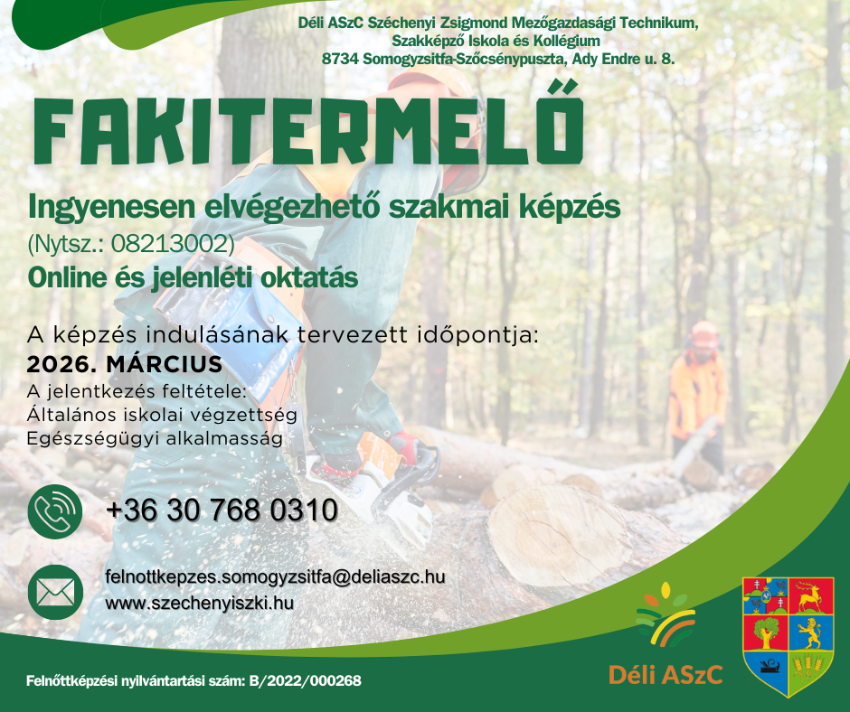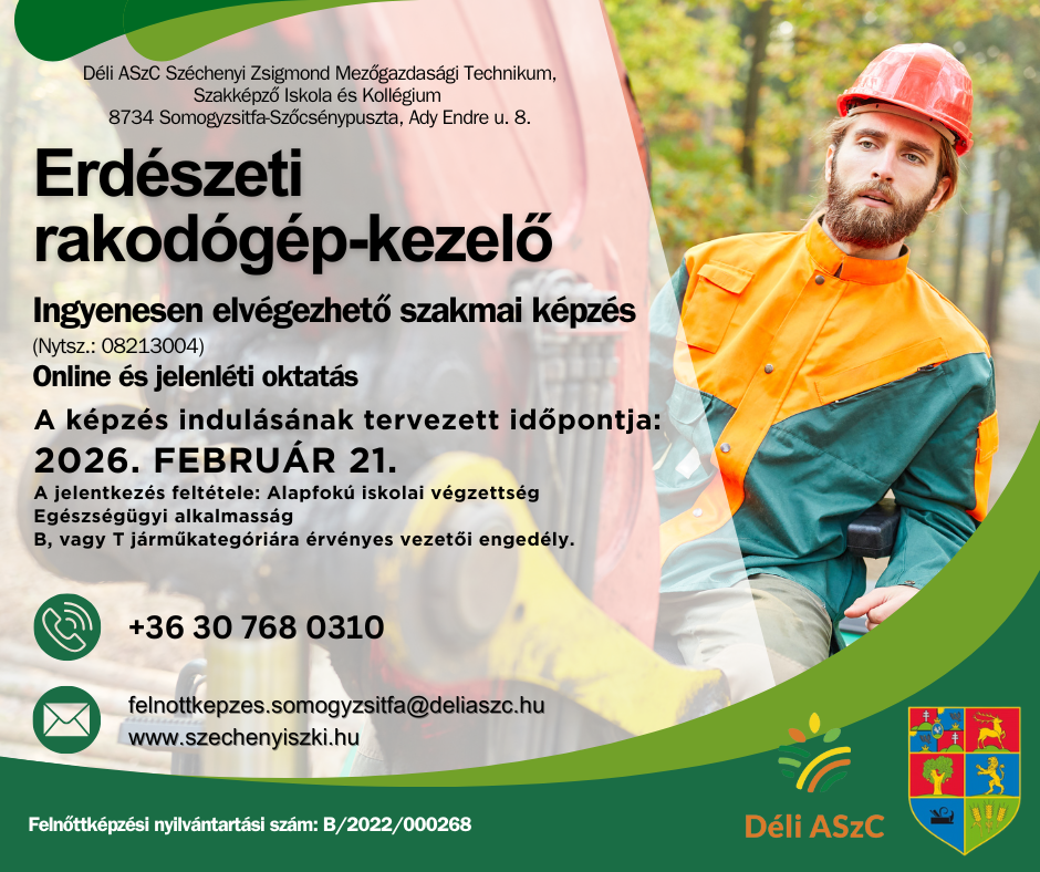 A somogyzsitfai Déli ASzC Széchenyi Zsigmond Mezőgazdasági Technikum, Szakképző Iskola és Kollégium 3 kiemelt, teljesen ingyenes szakmai képzést indít a közeljövőben, amelyek kiváló fejlődési lehetőséget biztosítanak:
