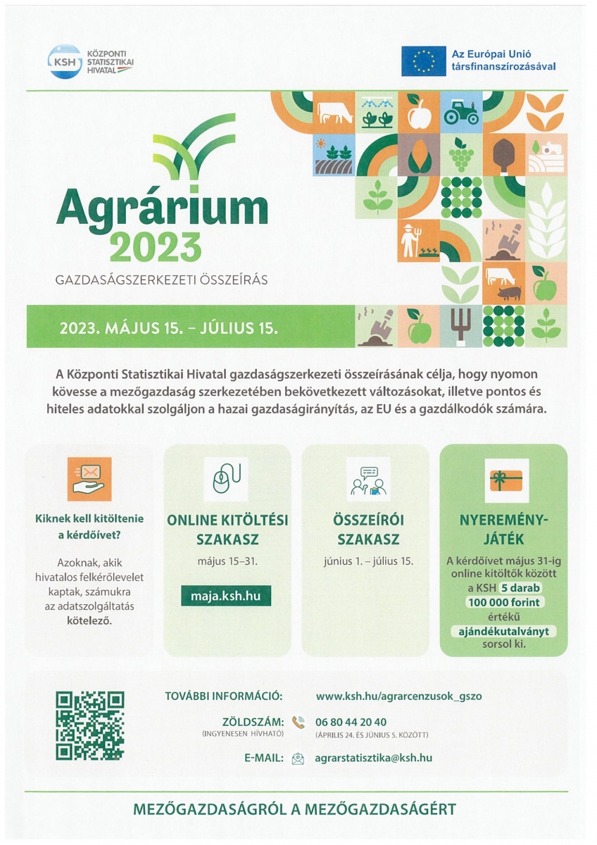 Tájékoztatjuk a Tisztelt Lakosságot, hogy a Központi Statisztikai Hivatal Szigetvár településen mezőgazdasági összeírást hajt végre Agrárium 2023. Gazdaságszerkezeti Összeírás elnevezéssel.